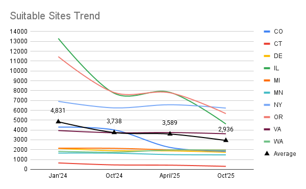 Across the states analyzed, most continue to see a decline in the number of suitable sites, but that trend is no longer universal. Several states, including New York, Illinois, Virginia, and Washington, show signs of stabilization or growth, indicating that site availability may be beginning to rebound in select submarkets.