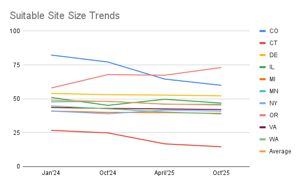 - Minnesota and New York maintained relatively stable site sizes, suggesting more consistent parcel availability or zoning flexibility.
