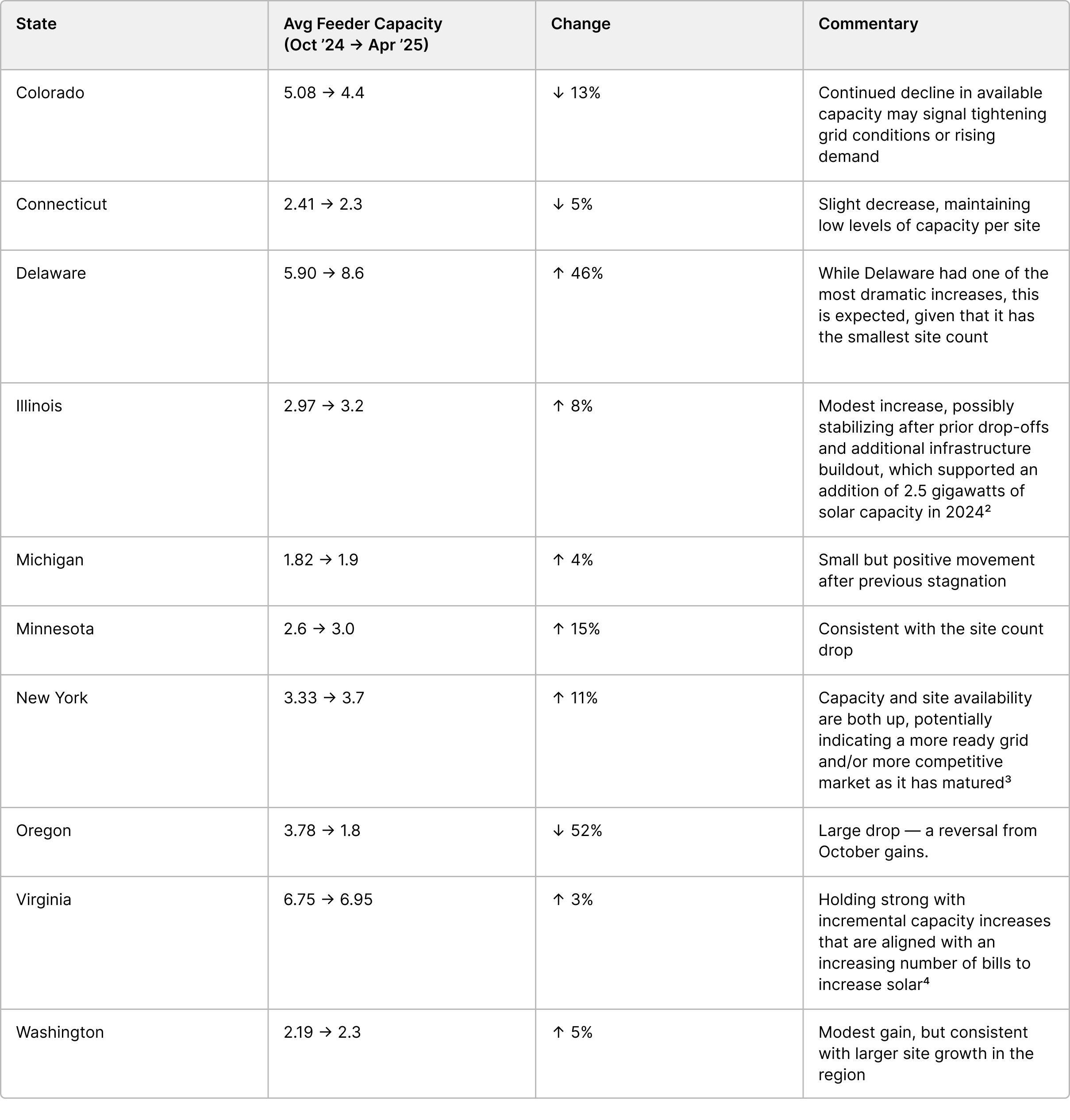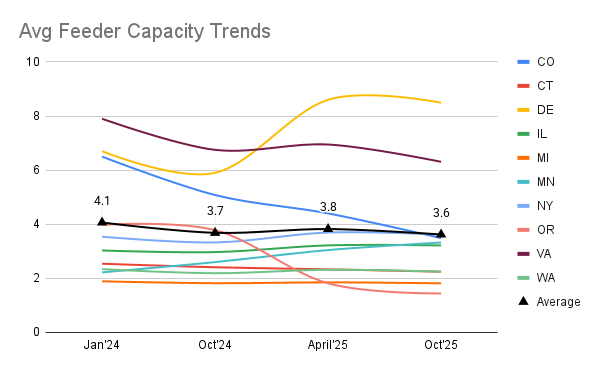 While some states remain flat or show continued decreases, others, including Delaware, Minnesota, New York, and Virginia, see measurable increases in available feeder capacity.