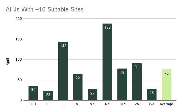 The chart below highlights the number of AHJs with 10 or more suitable sites as of April 2025. These jurisdictions represent high-concentration zones where developers may be able to identify viable projects with sufficient acreage and feeder capacity