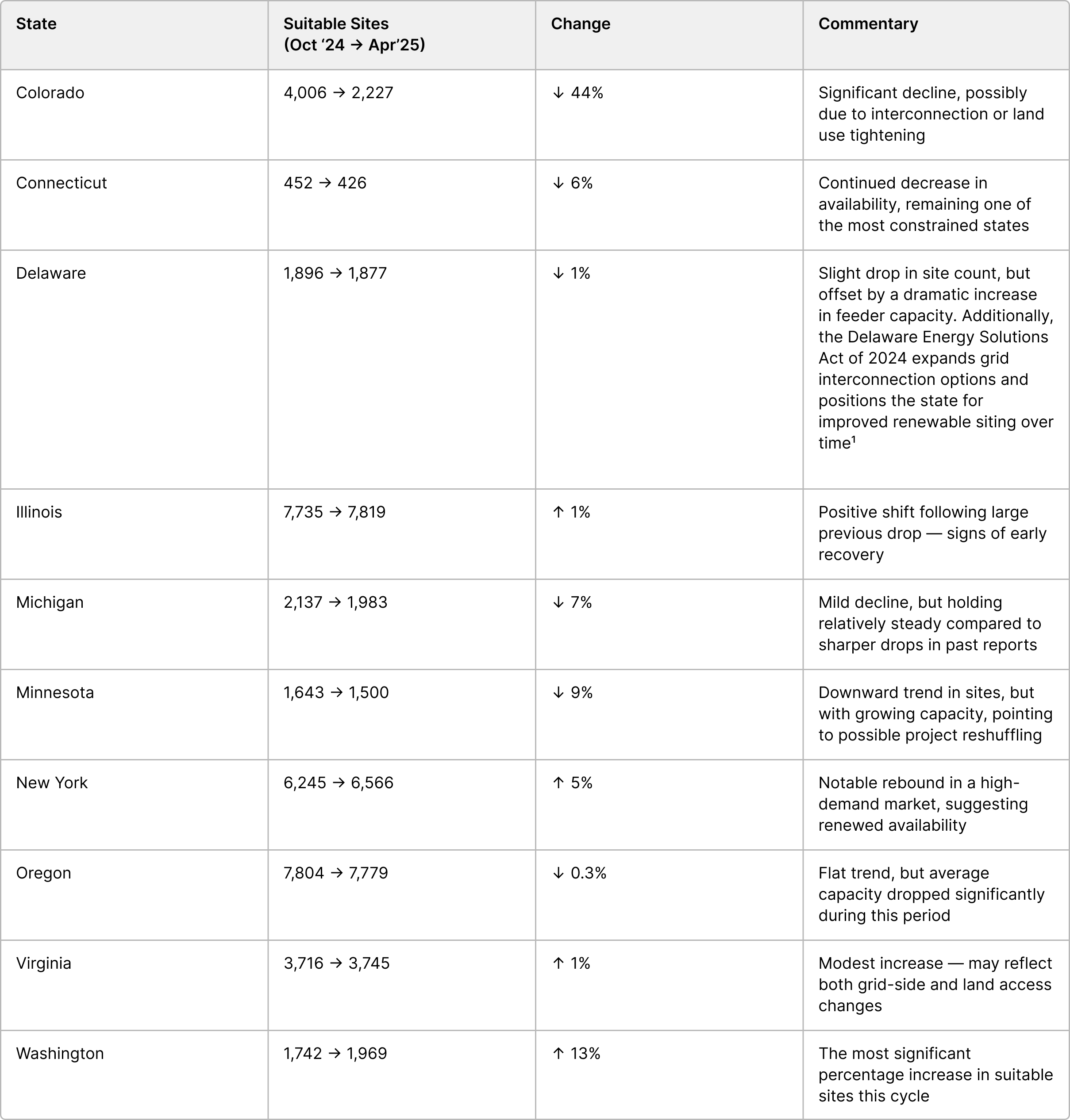 The solar development landscape is constantly evolving. For the first time in over a year, we’re seeing an increase in hosting capacity and a rebound in suitable site availability in several key states. While many regions continue to face challenges related to land availability and grid constraints, this shift suggests that new opportunities are emerging. Developers equipped with dynamic, site-level data are best positioned to act on them quickly.