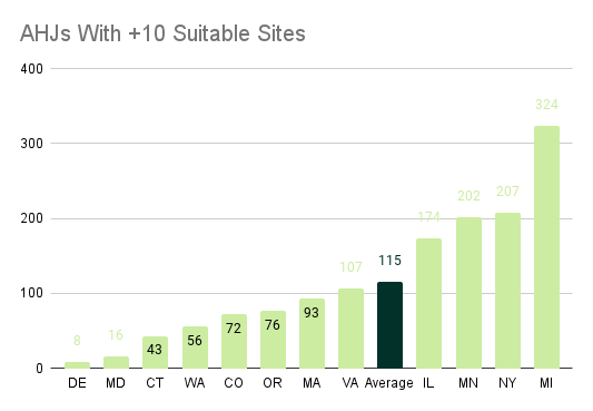 On average, states analyzed have 115 AHJs with 10 or more suitable sites, highlighting areas where developers can focus efforts to secure viable parcels.