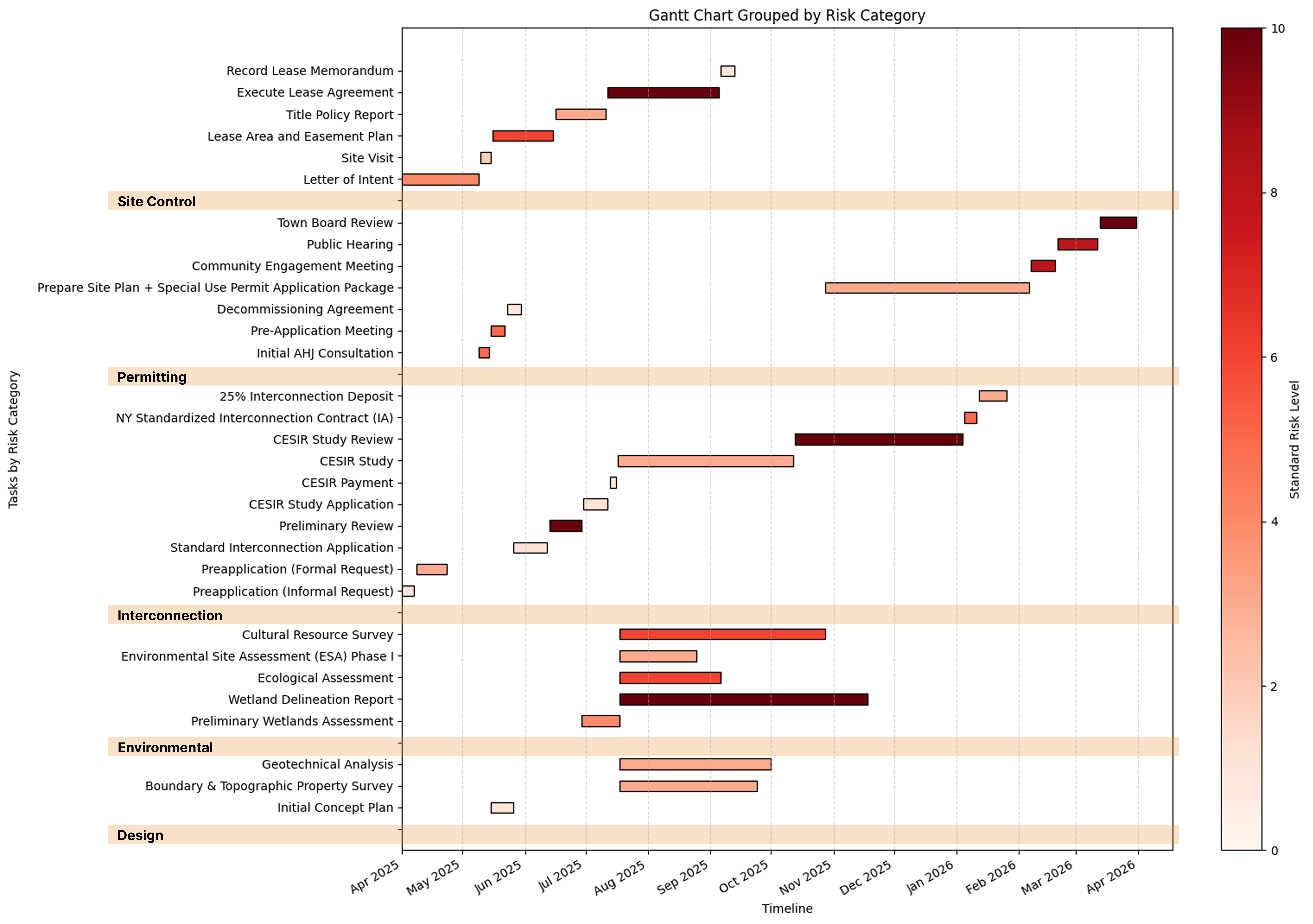 This Gantt chart visualizes the full development schedule for the proposed project, organized by risk category. Each horizontal bar represents an individual task, plotted from its estimated start to end date. Tasks are grouped under section headers by category (e.g., Permitting, Interconnection, Design), and the color of each bar reflects its associated risk level (darker reds indicate higher perceived development risk).