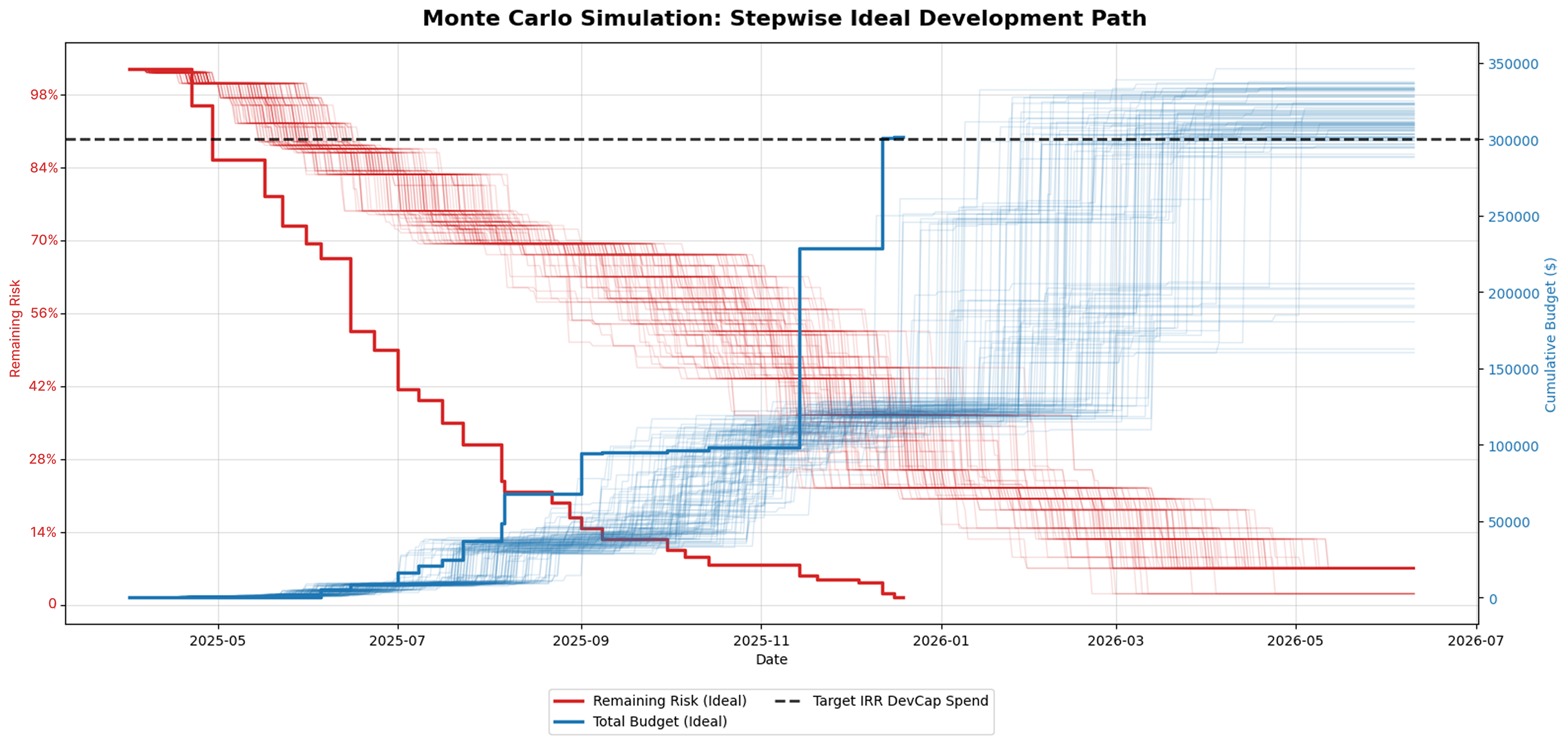 The chart below illustrates the results of a Monte Carlo simulation that models how development risk is reduced over time and how budget is spent across many possible project development scenarios. Each translucent line represents a single simulation run, showing one plausible path the project could follow in terms of risk reduction (left axis, red) and cumulative development capital spent (right axis, blue). The bold lines highlight one strategically sequenced, stepwise development path.